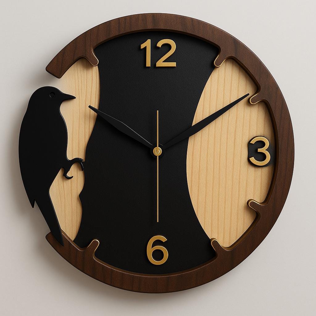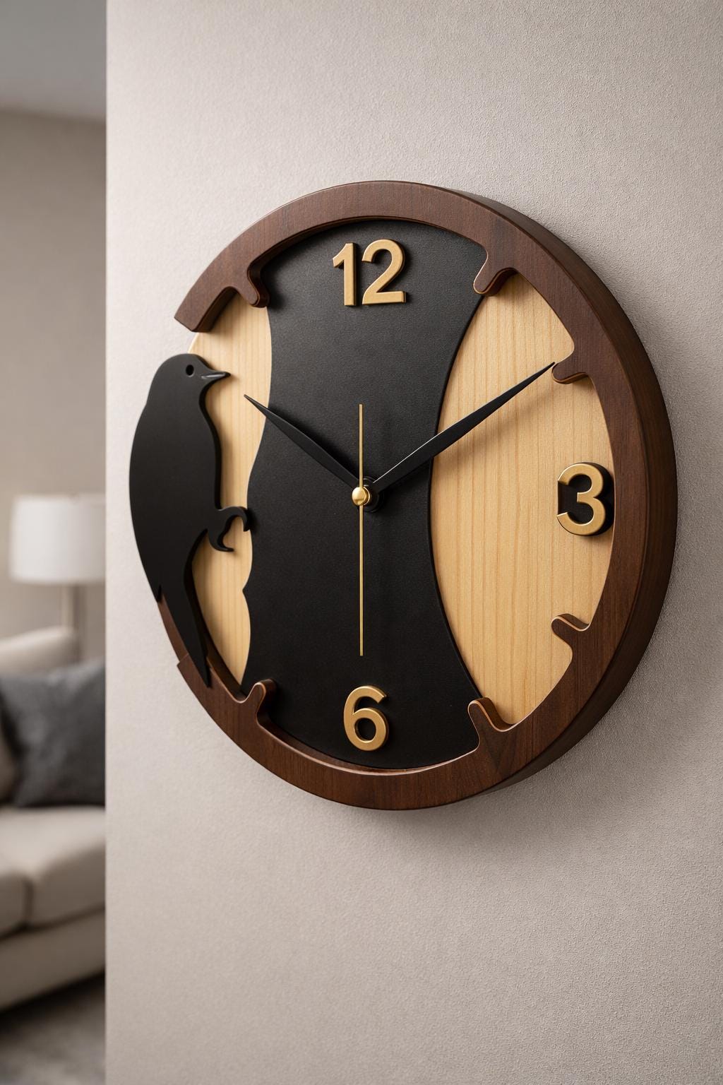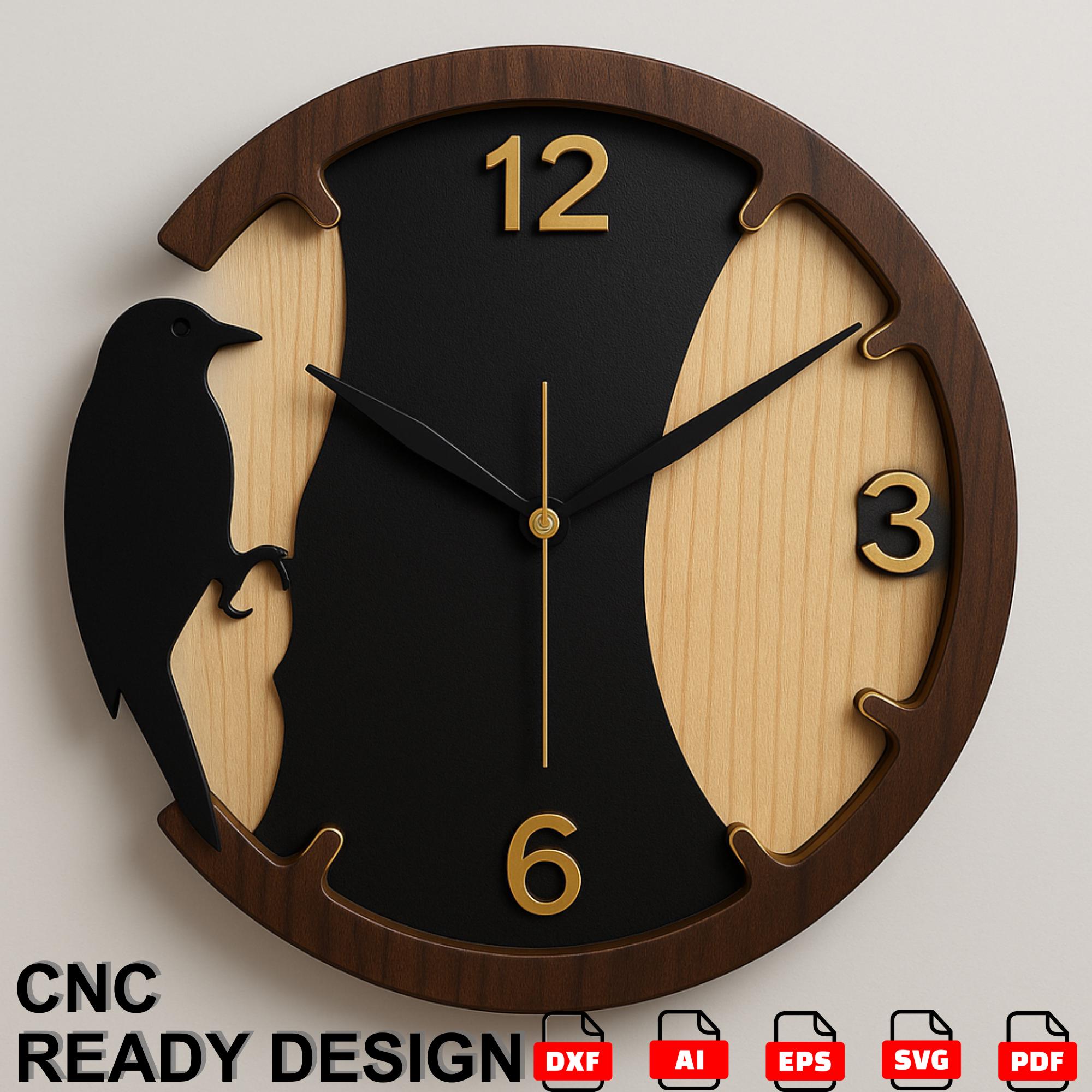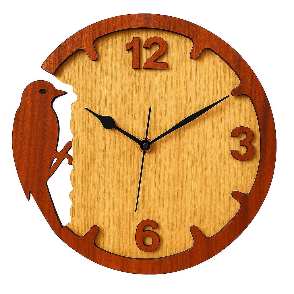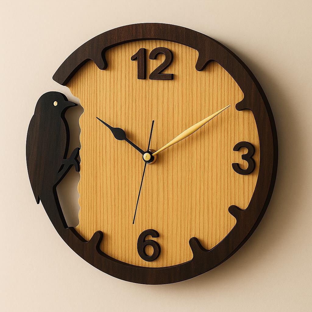 This clock design was created to stand out. Unlike simple geometric clocks, this one features a bird perched on the side, blending natural inspiration with functional design. The contrasting wood tones and clean cut lines make it an eye-catching piece of wall art, while the golden-number placements ensure readability when assembled as a functional wall clock.