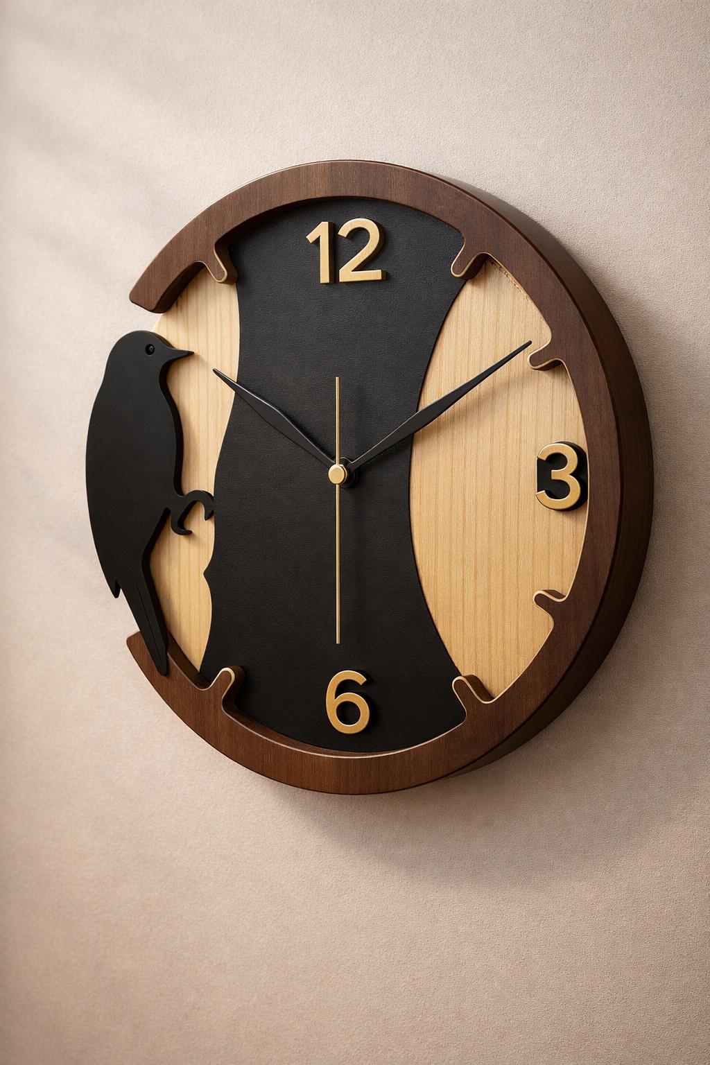 Design Style: Modern wooden wall clock with bird silhouette.