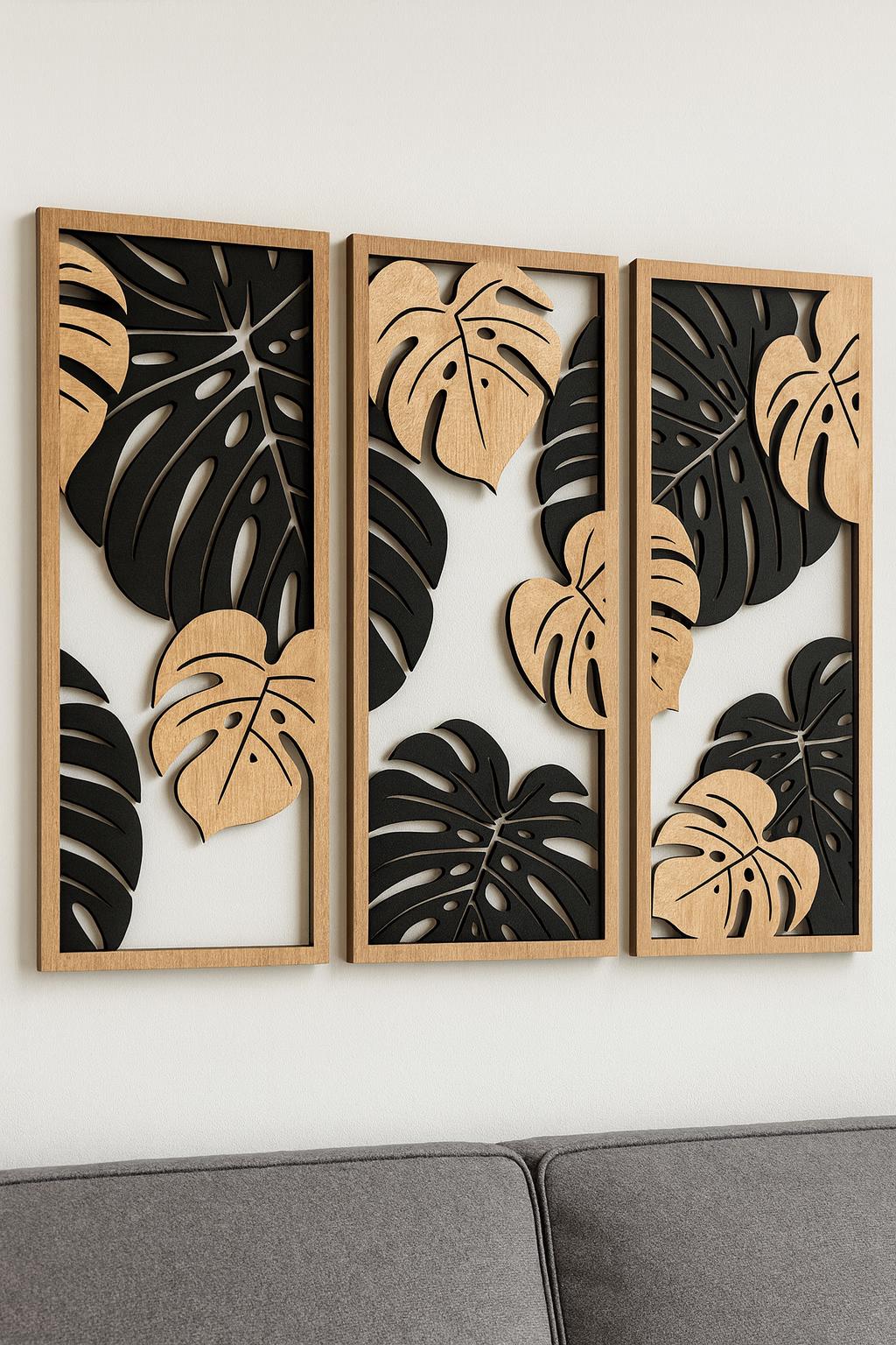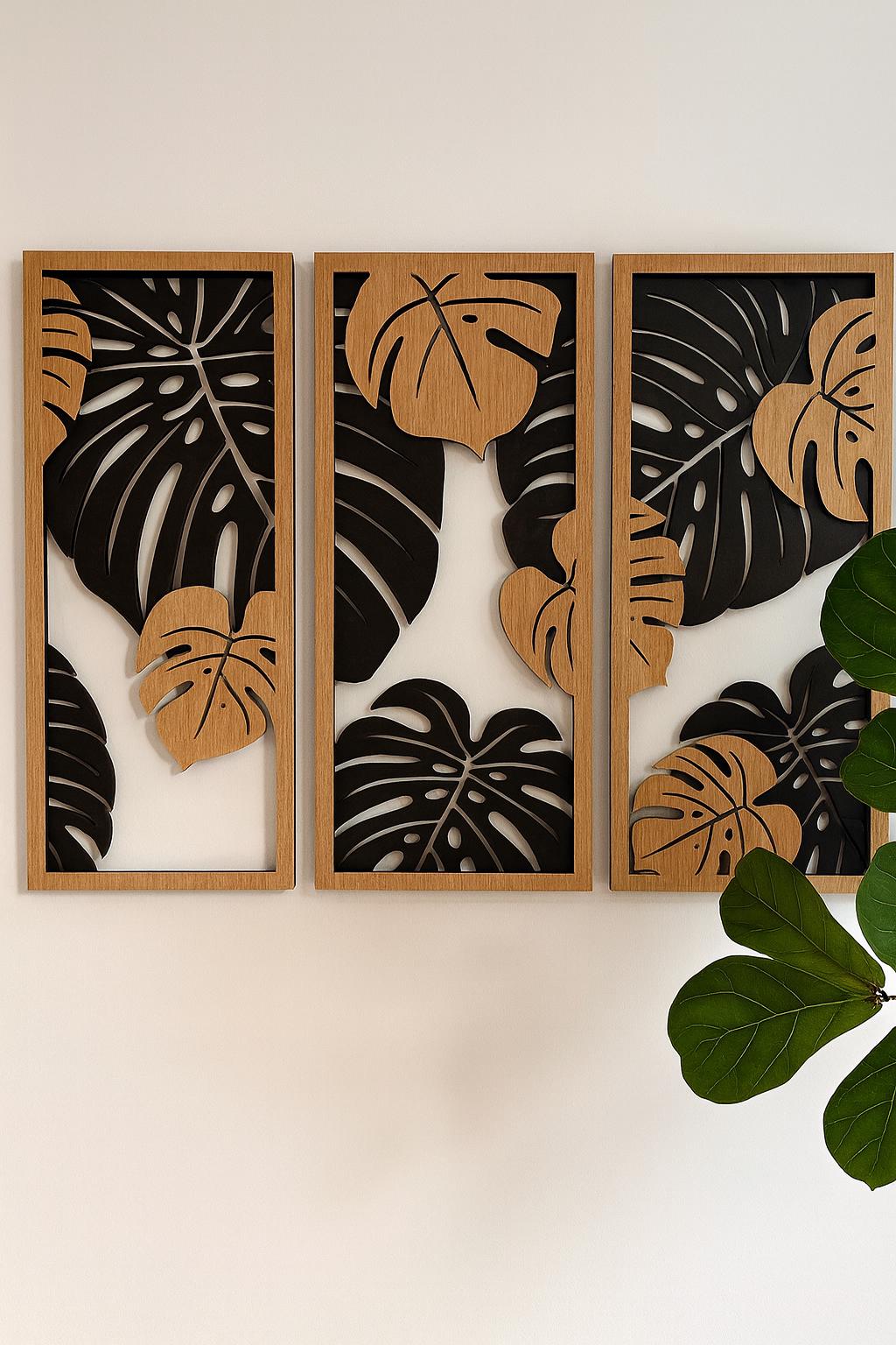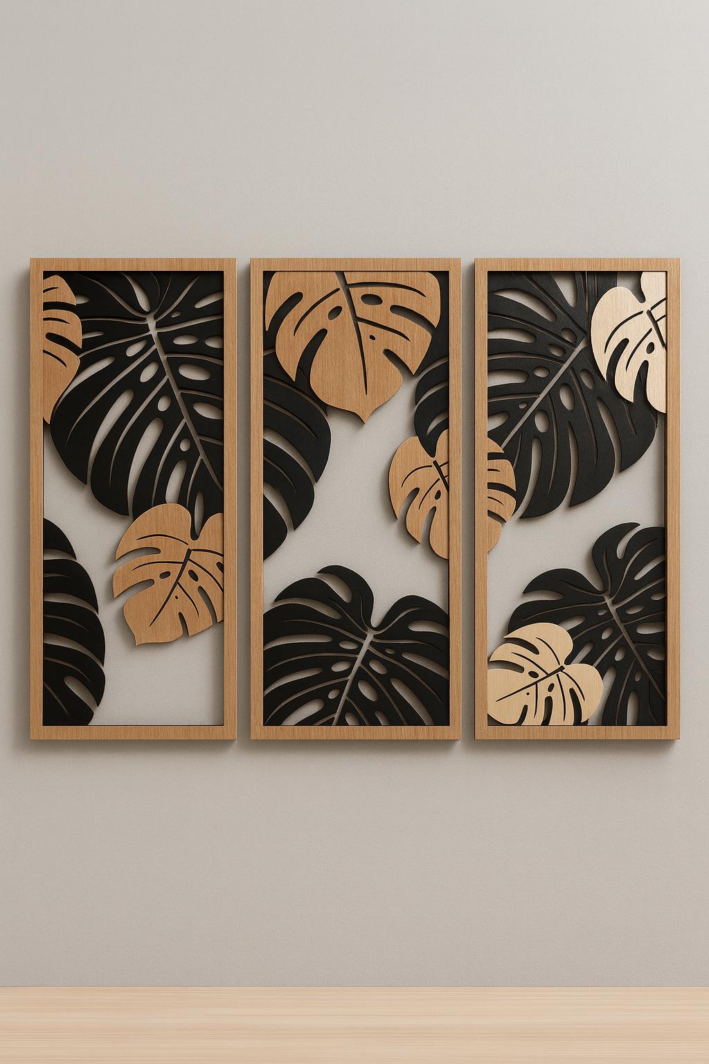This design features elegant Monstera leaf shapes, arranged in a modern panel-style layout. The layered leaf structure creates depth and visual interest, making it a strong statement piece for contemporary interiors.