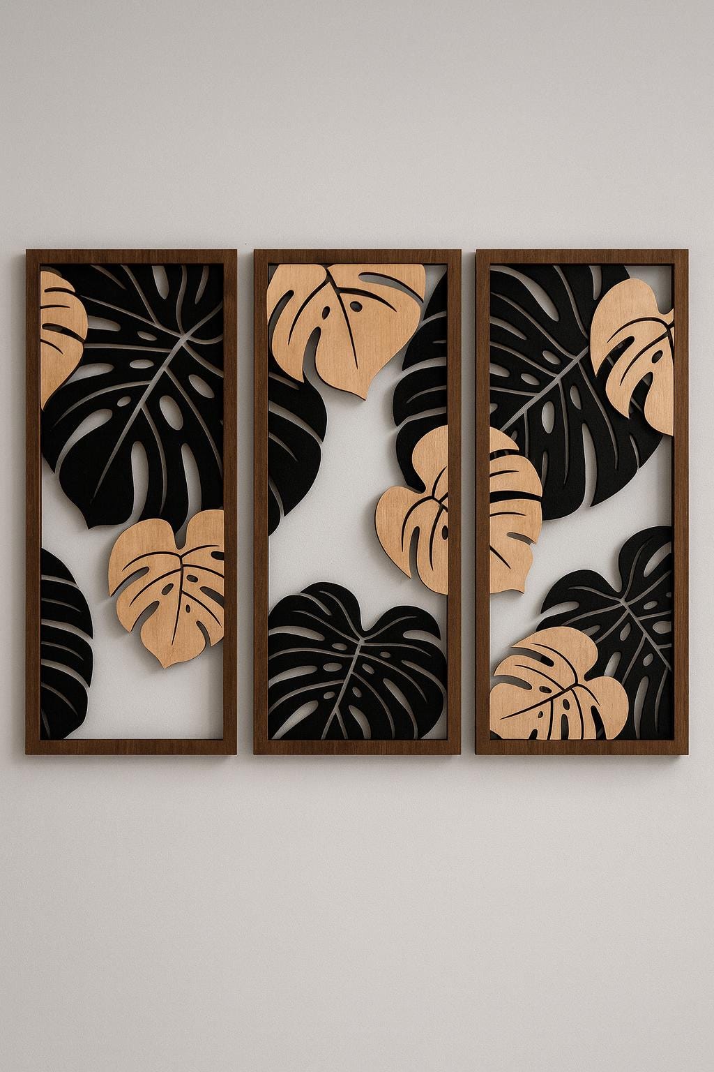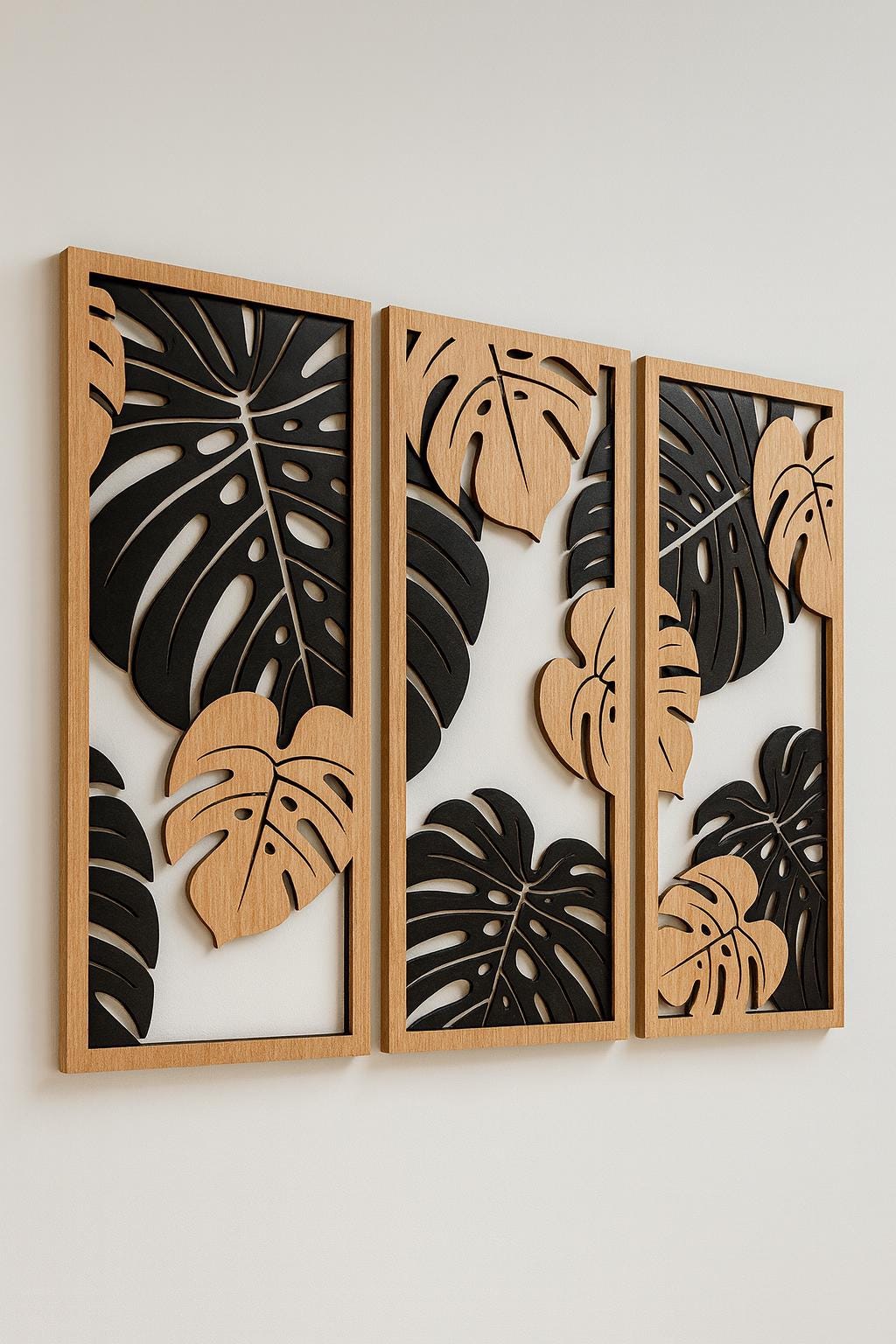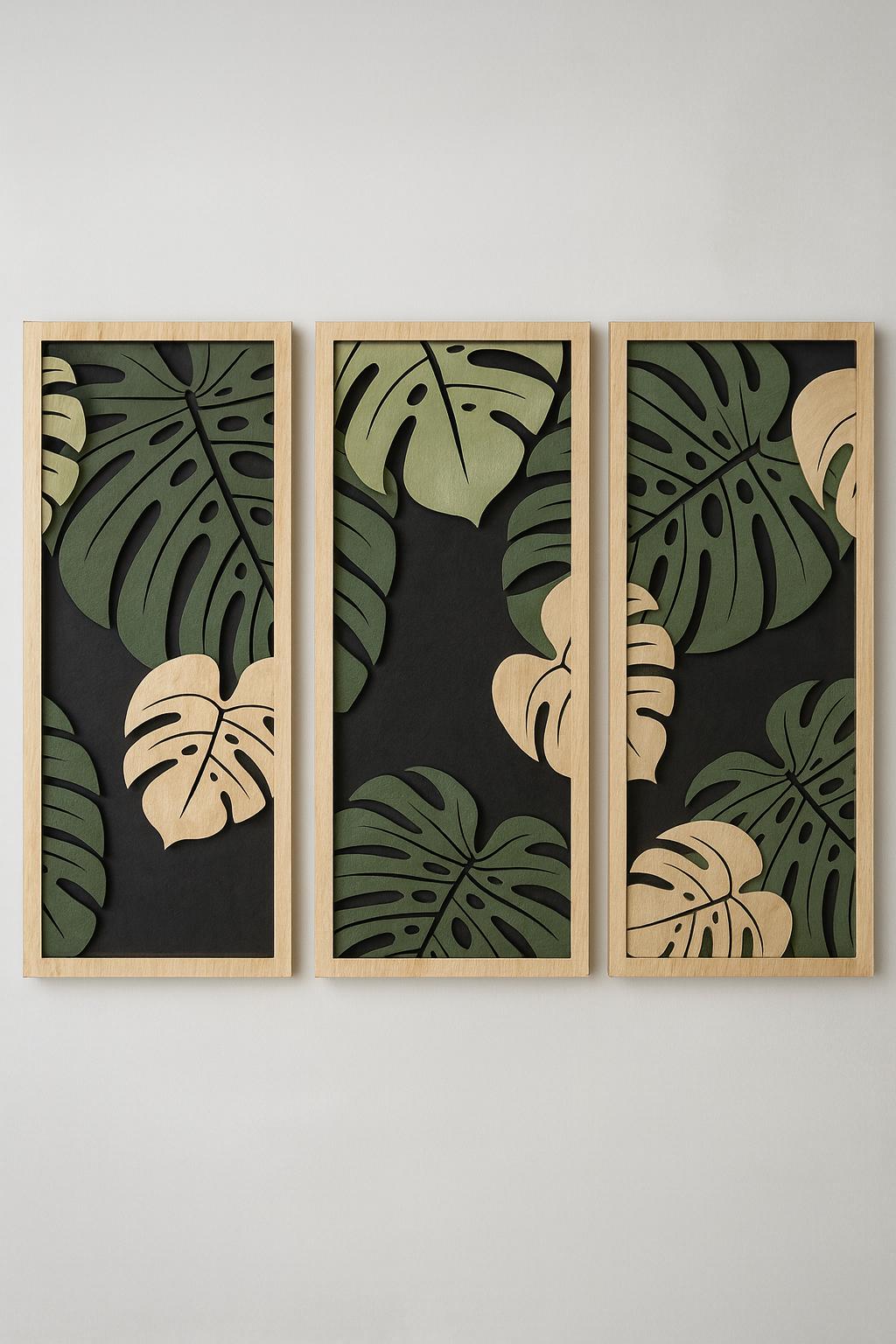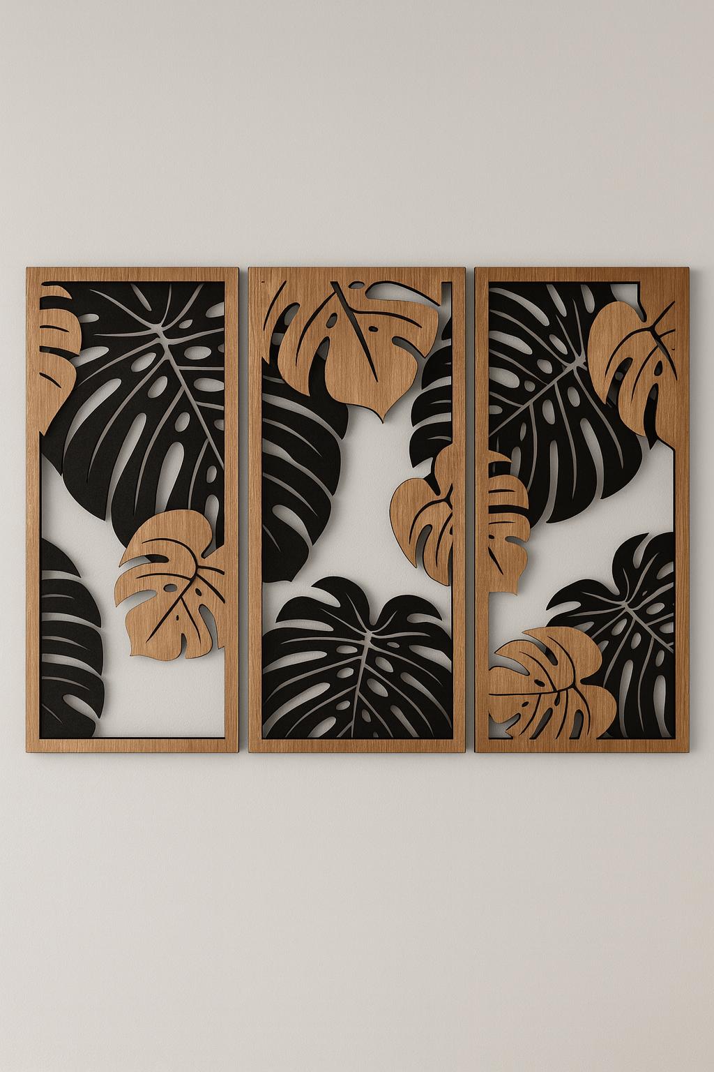 This design features elegant Monstera leaf shapes, arranged in a modern panel-style layout. The layered leaf structure creates depth and visual interest, making it a strong statement piece for contemporary interiors.