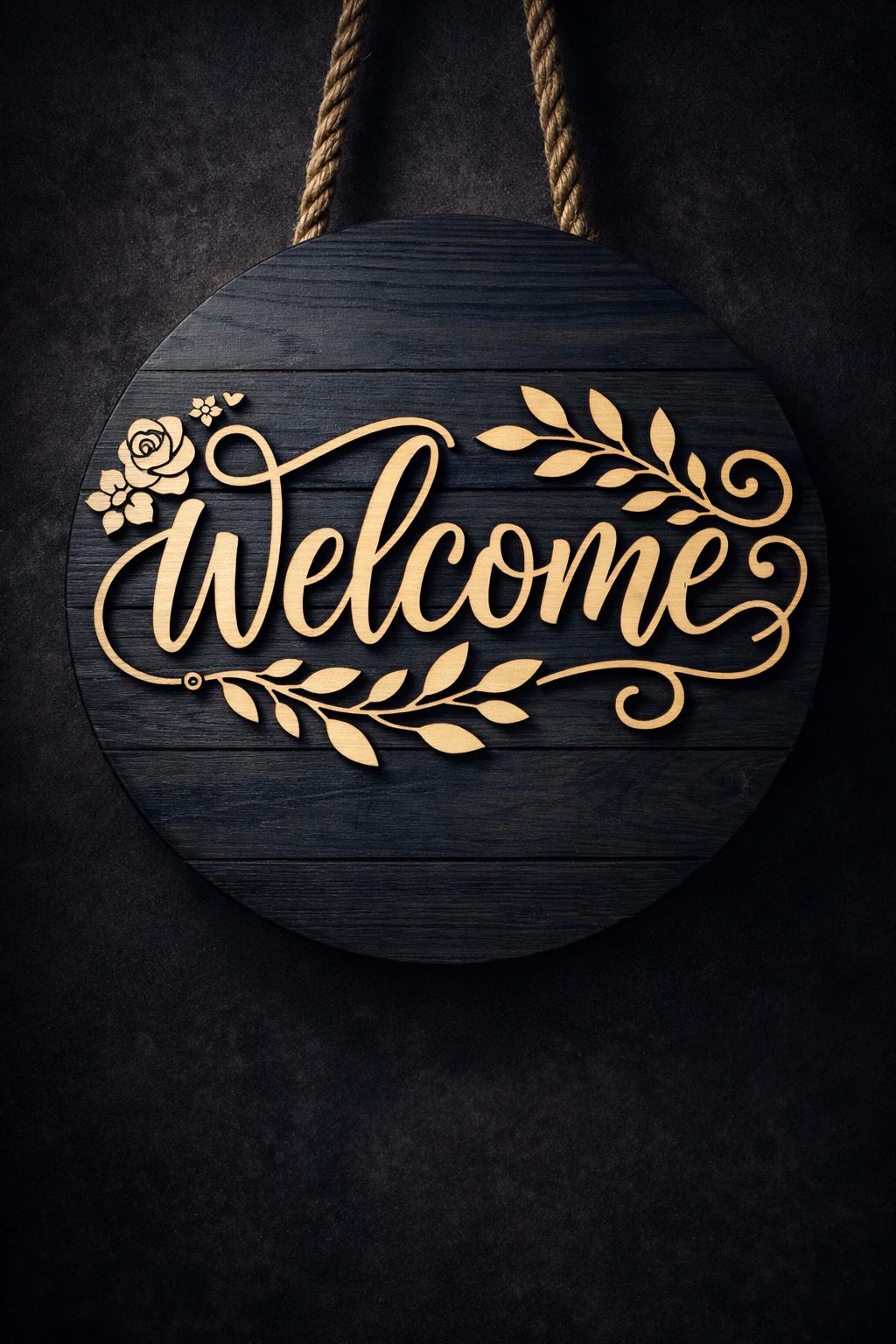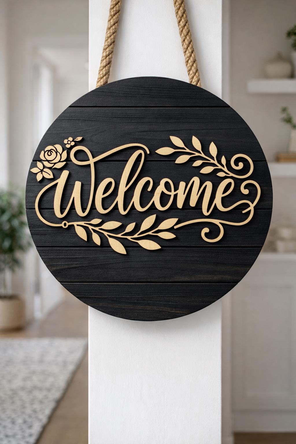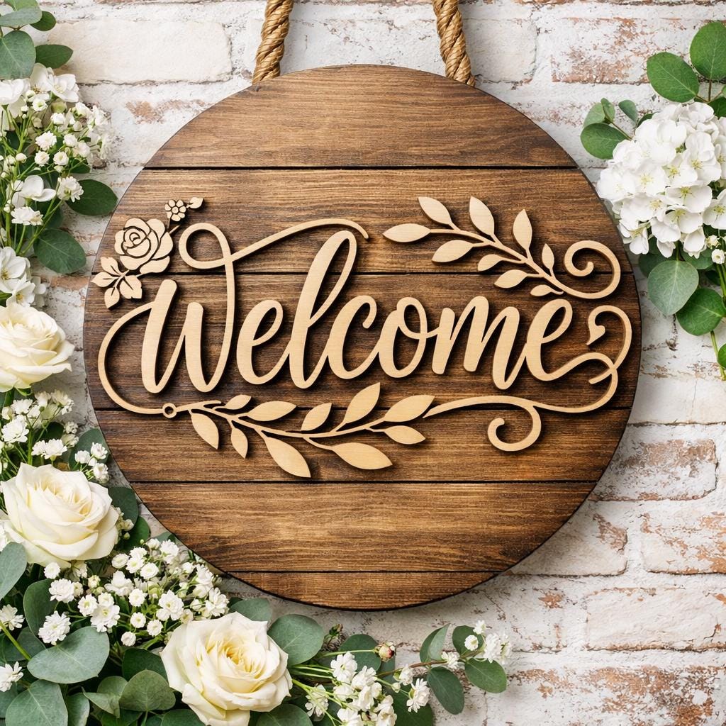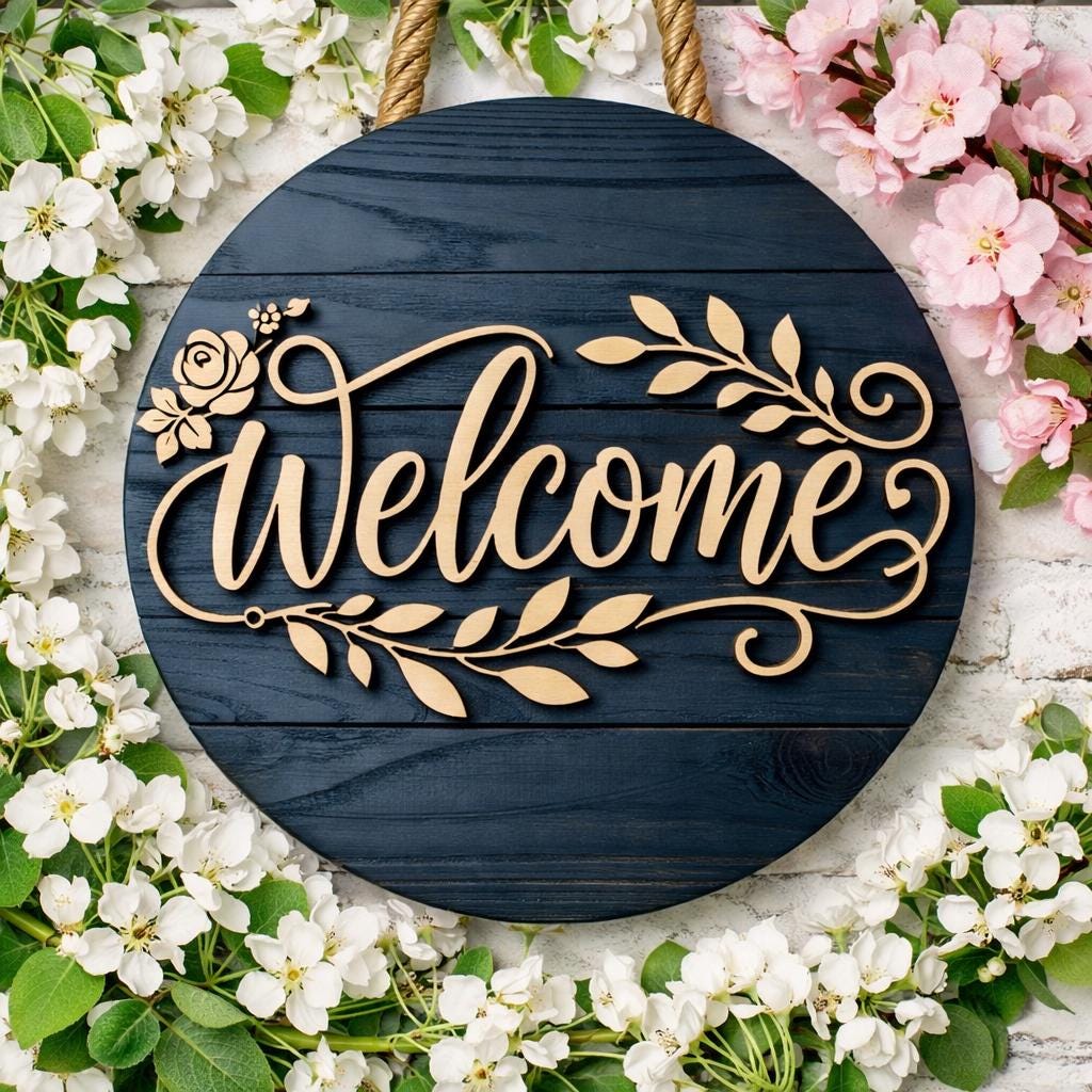 This is a premium round Welcome sign design created for CNC routers and laser cutting machines. The design is perfect for front doors, entryways, porch decor, and wall art. It works beautifully as a layered wood sign using plywood, MDF, or solid wood.