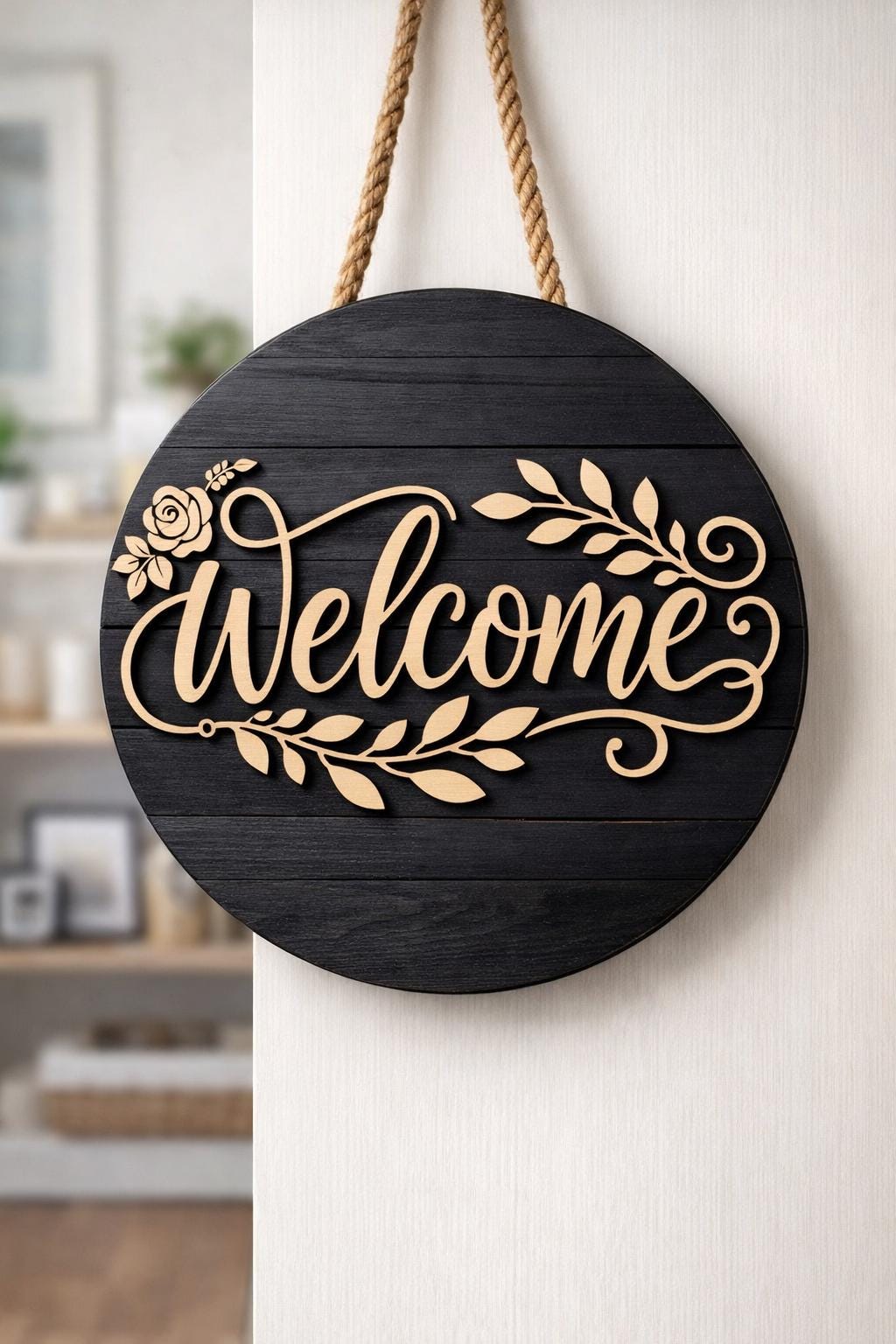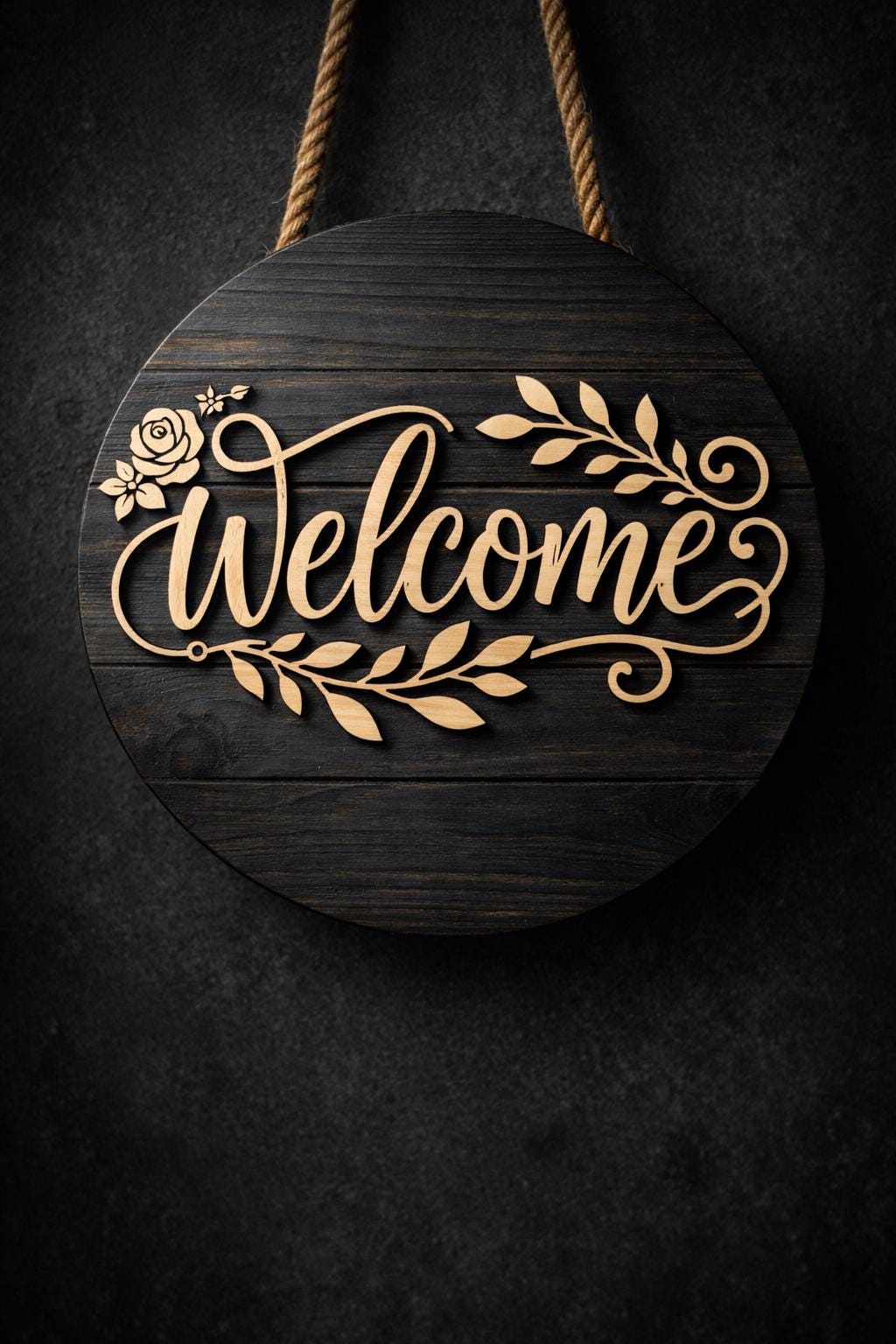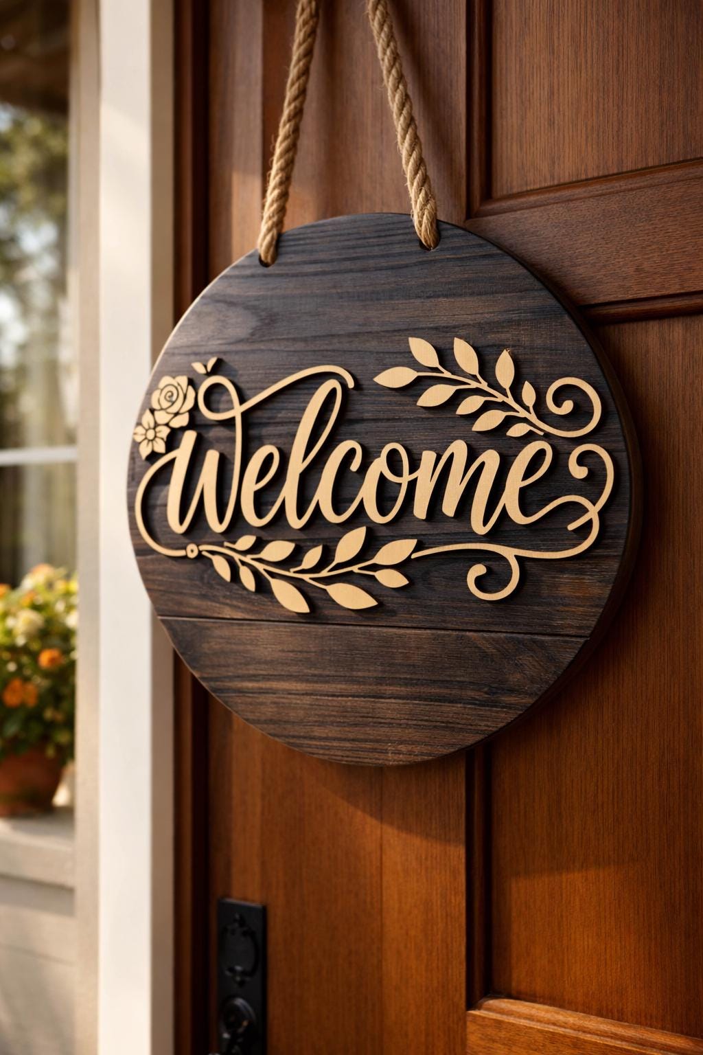 This is a premium round Welcome sign design created for CNC routers and laser cutting machines. The design is perfect for front doors, entryways, porch decor, and wall art. It works beautifully as a layered wood sign using plywood, MDF, or solid wood.